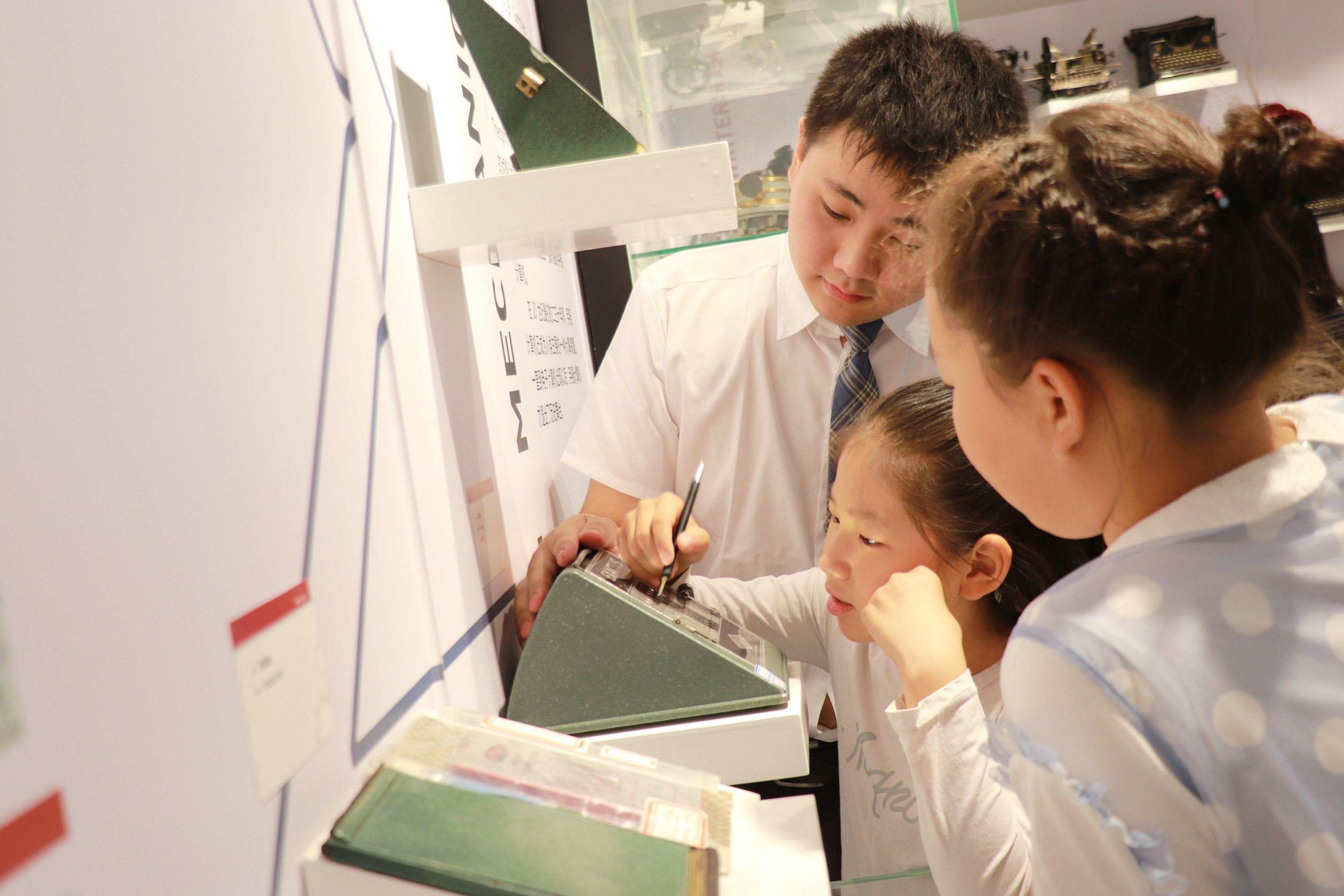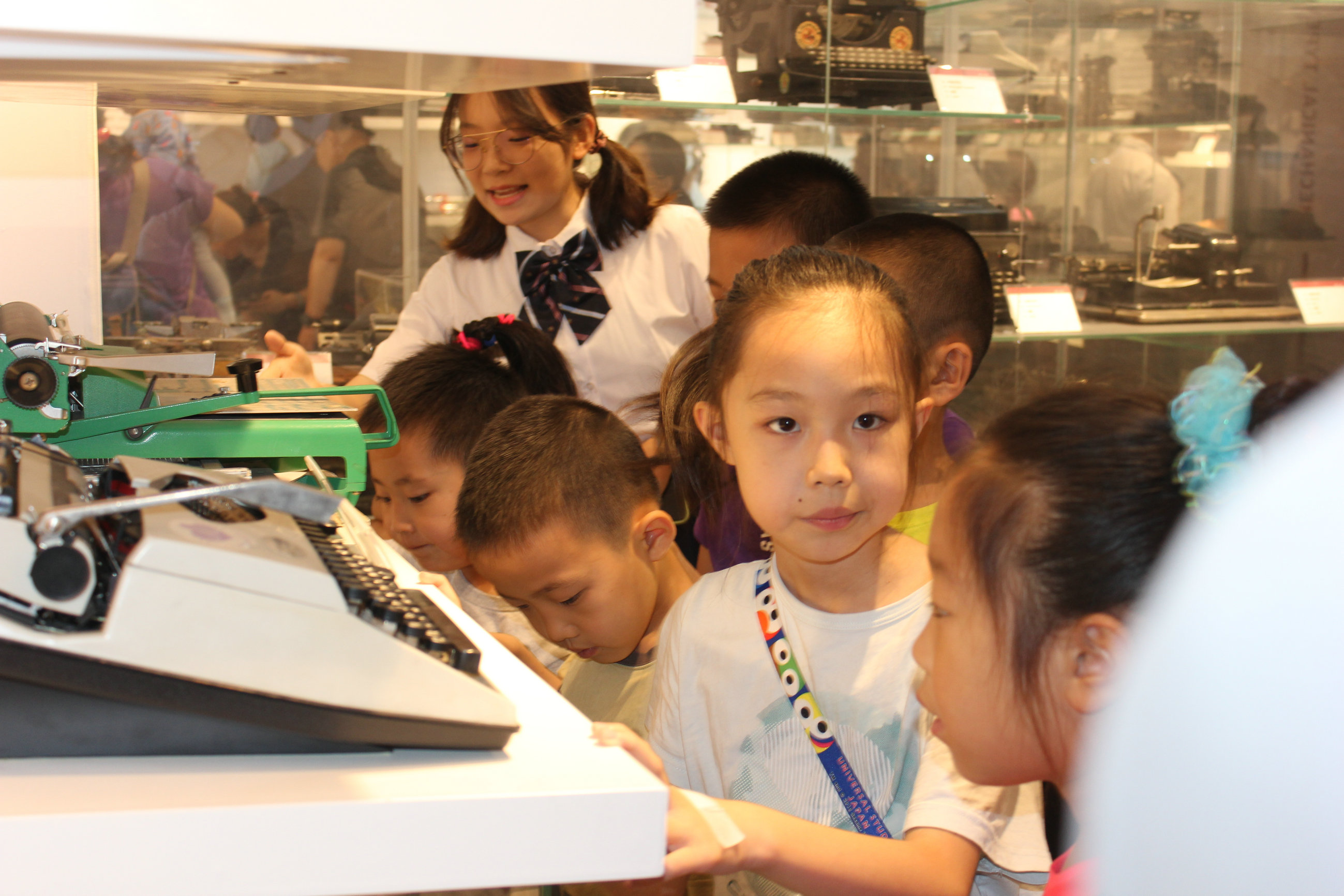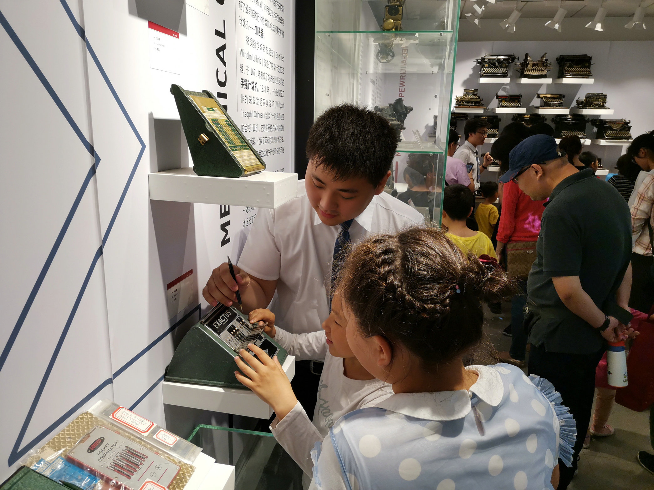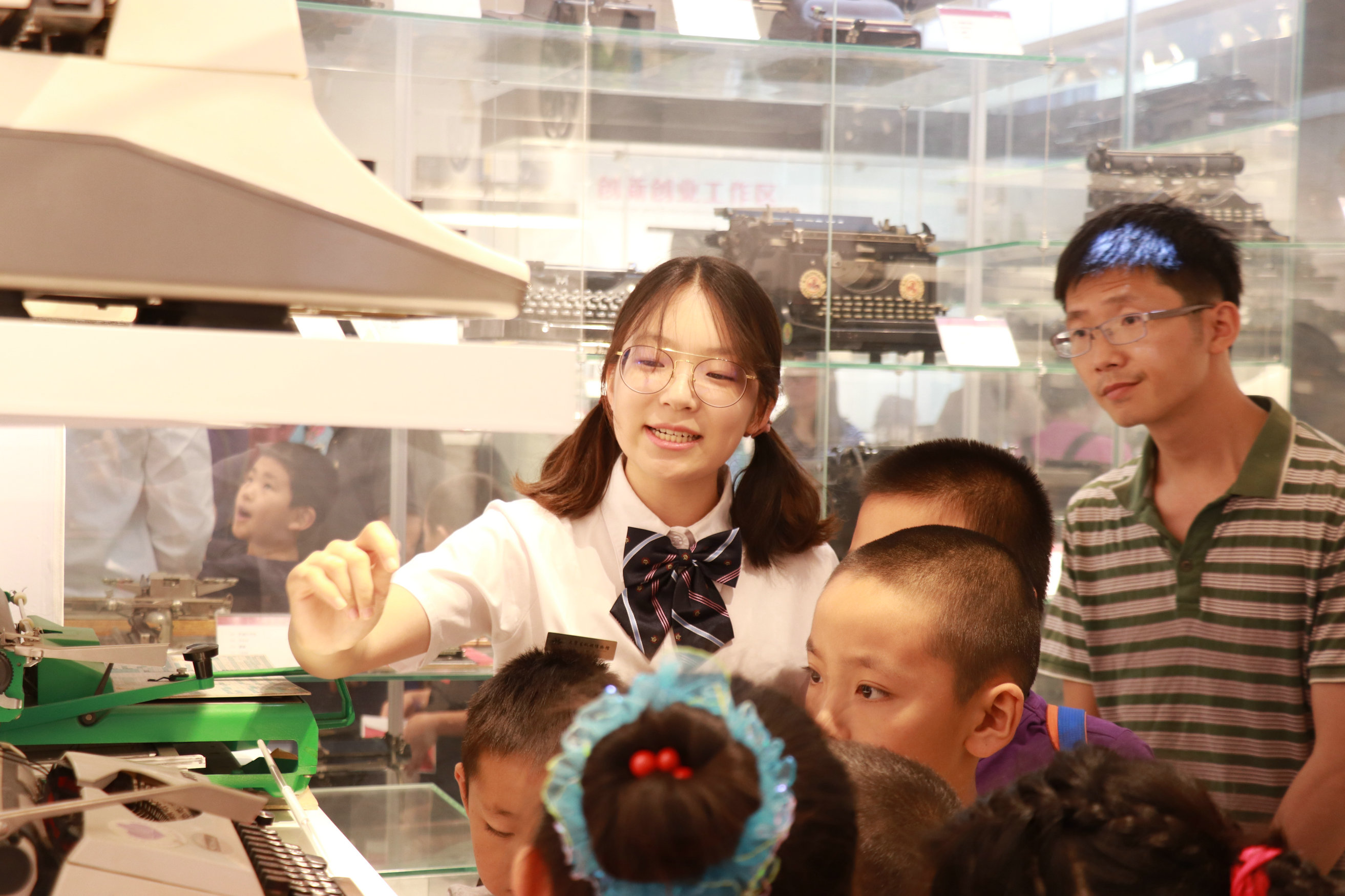一进门,小朋友们就被展台上各式各样的打字机深深吸引了,这是怎么工作的呢?快来听听老员工志愿者敖嘉姐姐是怎样介绍的吧。