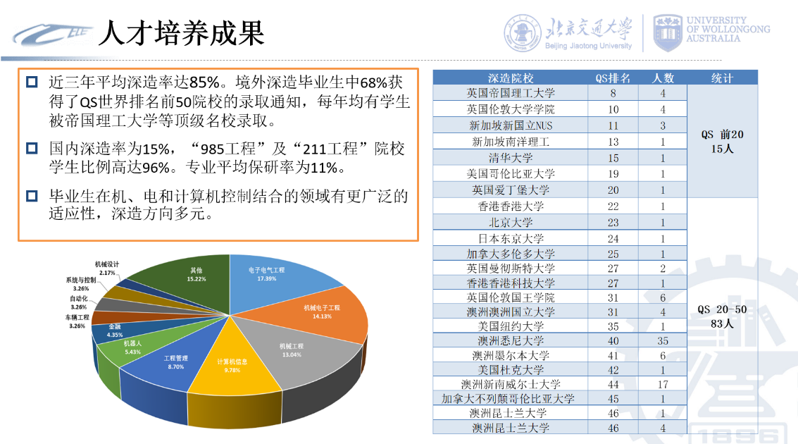 机械电子工程专业2021届毕业生是硕果累累的一届,令人骄傲的一届,他们克服疫情对学业及深造的影响,仍取得不菲的成绩。本届毕业生65人,深造率高达80%,国外深造院校全部位列QS前100位。