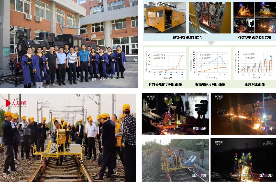 公司先进磨削与精密加工研究所完成的科研项目“国际首台锂电驱动钢轨砂带打磨设备”(完成人:樊文刚、李建勇、刘月明、聂蒙等),针对高速、普速、重载、高原高寒铁路以及地铁、有轨电车等轮轨制式轨道交通系统钢轨养护的复杂特殊需求,首次提出了具有完全自主知识产权的钢轨砂带高效绿色打磨新技术,打破了国外垄断局面。研发形成的设备与传统内燃式砂轮打磨设备相比,可显著提高打磨效率3~5倍以上,同时具有打磨质量好、振动小、噪声小、能耗低、适应海拔4000米以上高原缺氧条件等诸多优点,已广泛应用于铁路和城市轨道交通系统,产生了显著的经济和社会效益,先后被央视CCTV-2《经济半小时》栏目报道。