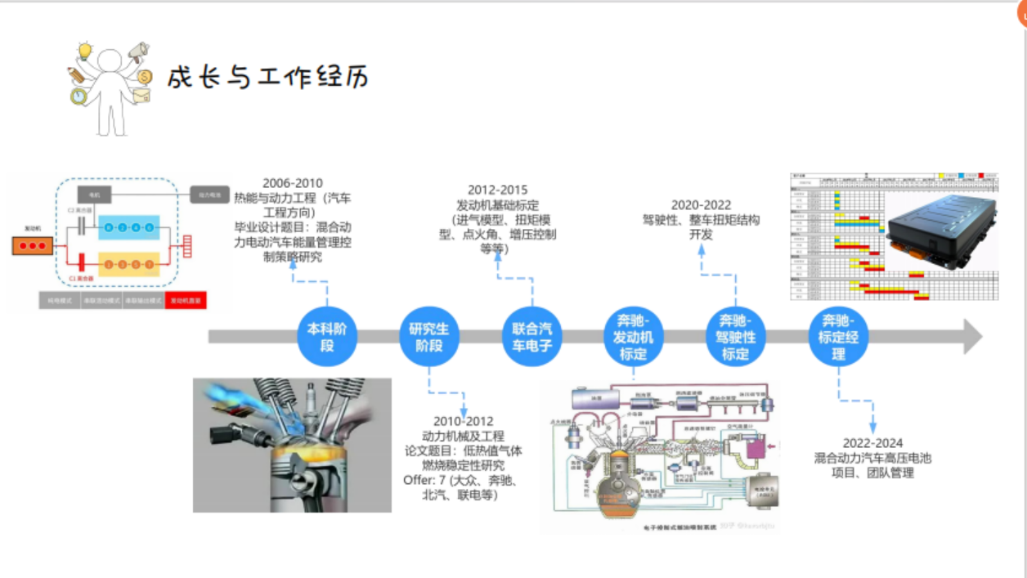 陈立超首先分享了他进入汽车行业工作的成长与工作经历,介绍了在研究生毕业时从收到的大众、奔驰、北汽、联合汽车电子等7家单位录取通知中做选择时的思考,以及工作后从联合汽车电子的发动机标定工程师转到奔驰的发动机标定工程师、驾驶性标定工程师,再到成长为混合动力汽车项目标定组经理过程中的选择、思考与坚持。